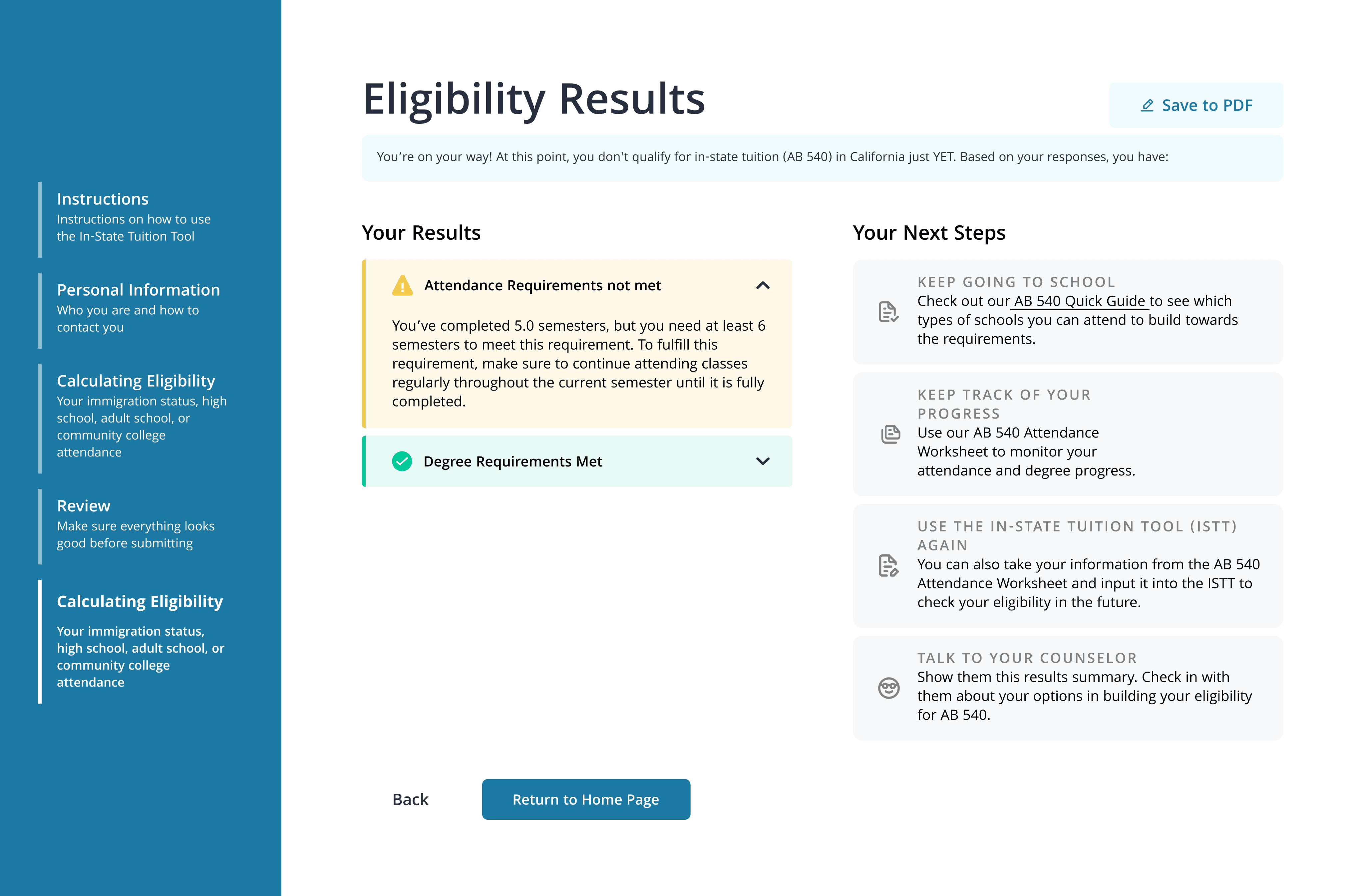 Unmet requirements are surfaced first and visually emphasized, with clear explanations for why they were not met. Collapsible sections help users focus on critical gaps while keeping completed requirements accessible.