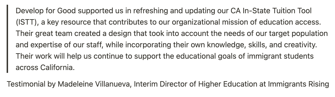 Partnering closely with the Immigrants Rising team, we co-created a solution that honored their expertise while bringing in fresh perspectives, helping us balance user needs with organizational goals.