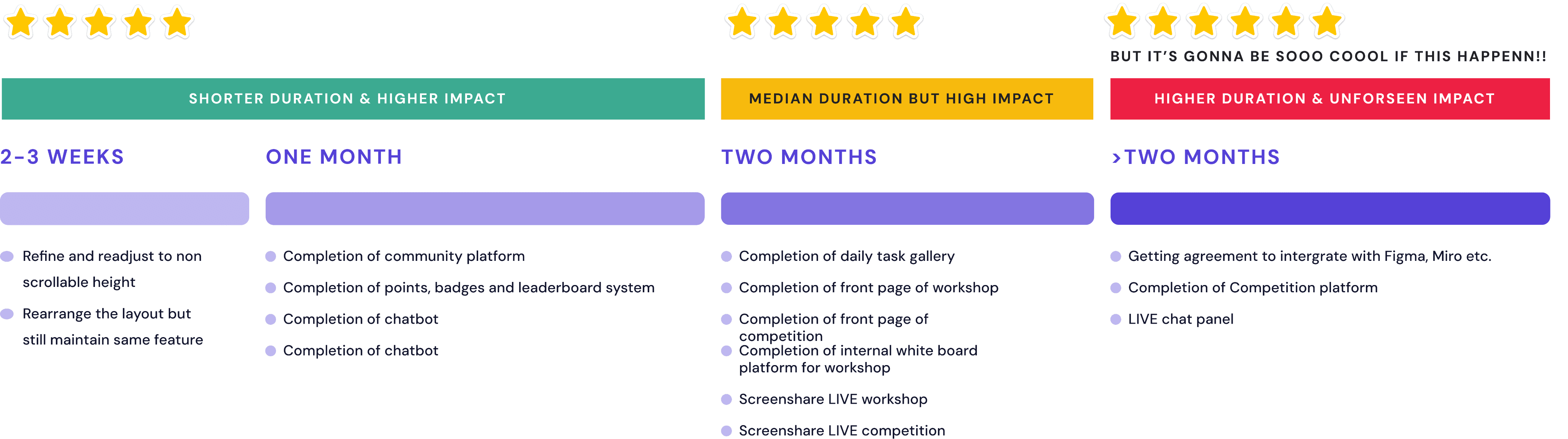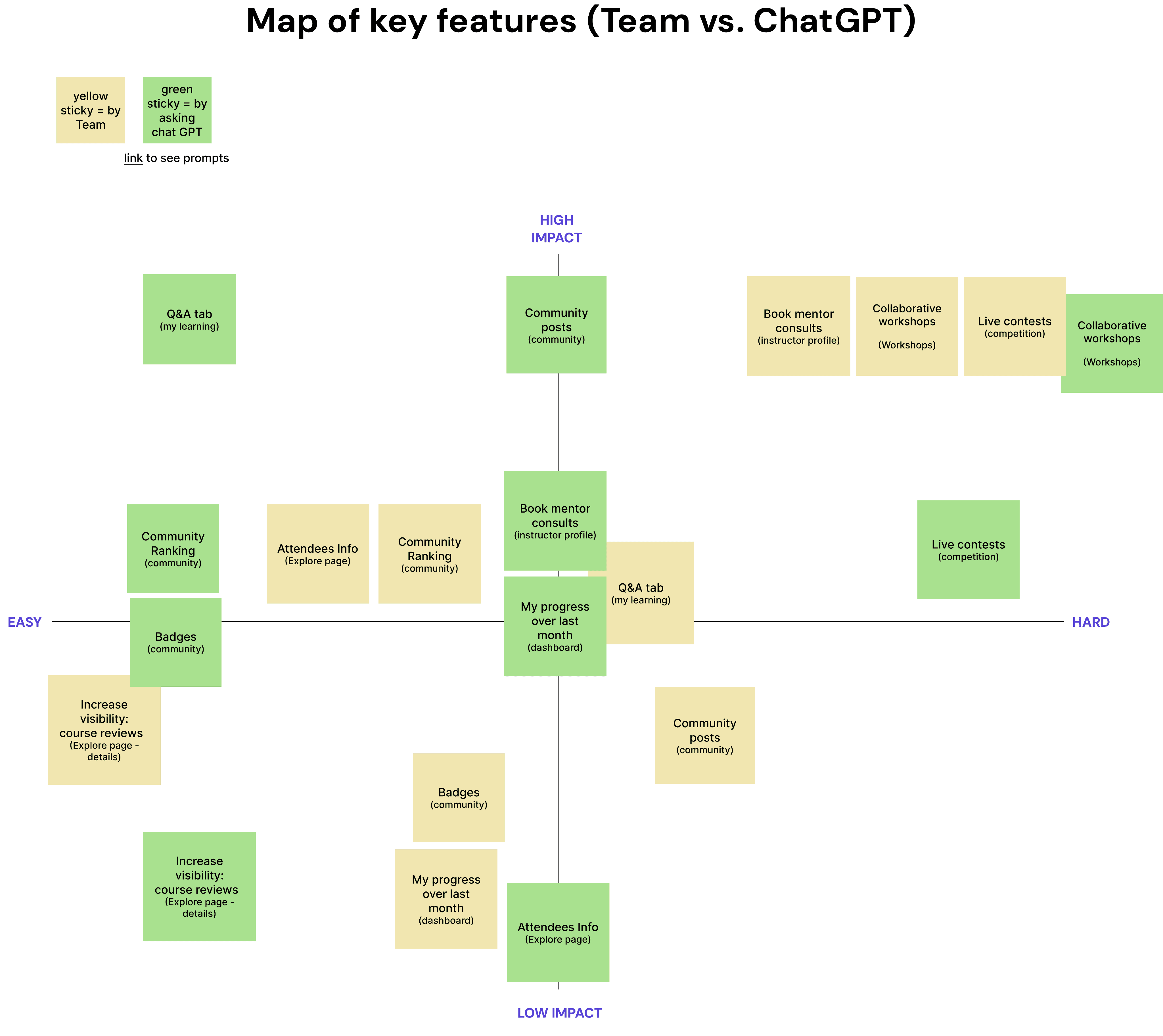 To identify key features to include in our prototype, we compiled a list of features and mapped them according to difficulty of development and level of impact, along with chatGPT’s response