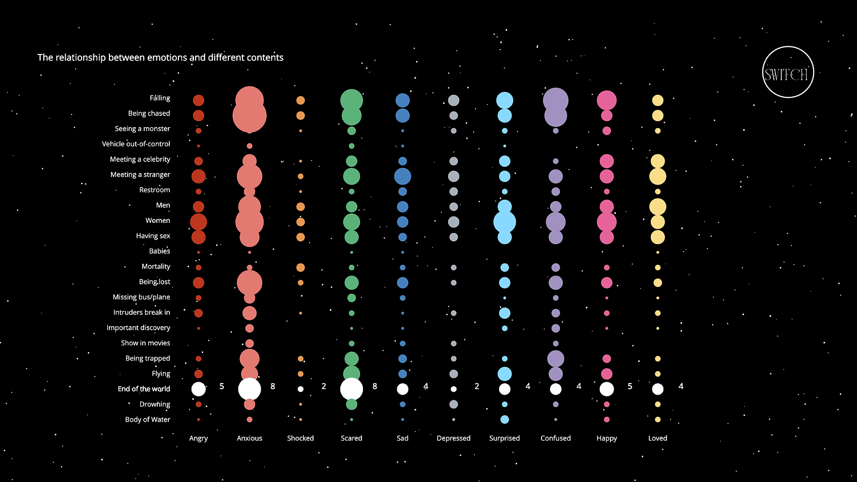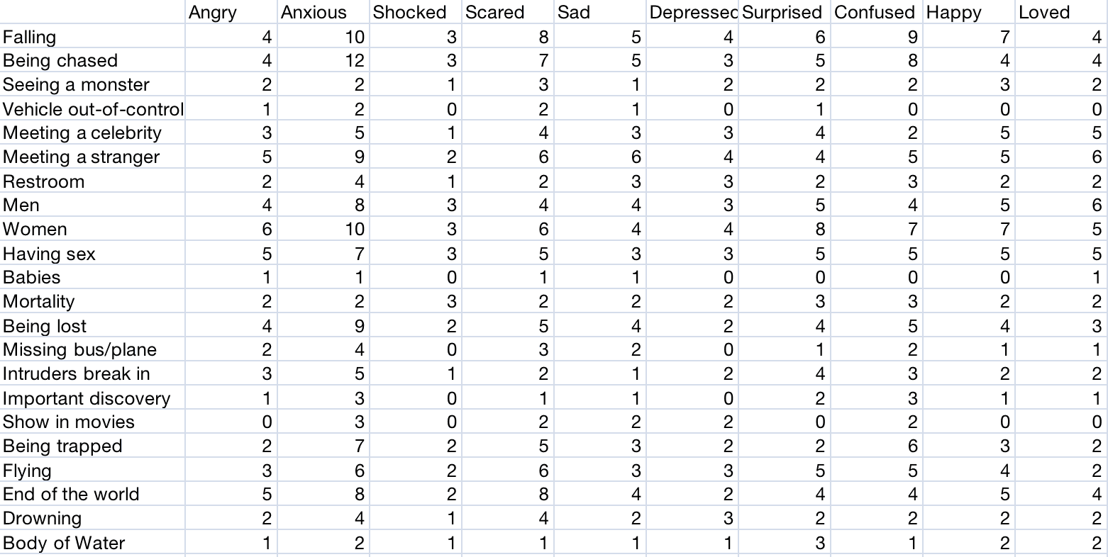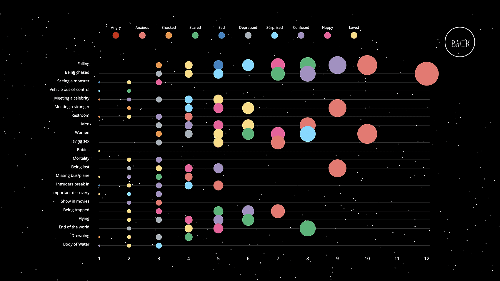 Want some kind of data visualization like this. On the left side is common dream topics, and horizontally are all the different emotions. The size of the circle indicates how often that emotion is associated with that topic, and different emotions have different colors.